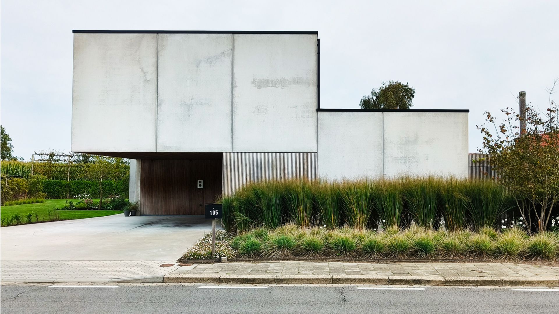 Les matériaux de façade utilisés ainsi que la sobriété de leurs détails soutiennent la conception épurée de la maison. Les façades sont constituées de panneaux de façade isolés continus, avec une paroi extérieure de béton apparent lisse. Le double carport en porte-à-faux est recouvert de bardages et de plafonds en bois sur tout son pourtour et se prolonge en partie sur la façade avant. L'impressionnant porte-à-faux des panneaux de béton de grand format est rendu possible par un treillis de sections en caisson dans la façade avant et une poutre en treillis sous la fenêtre de la bande latérale.