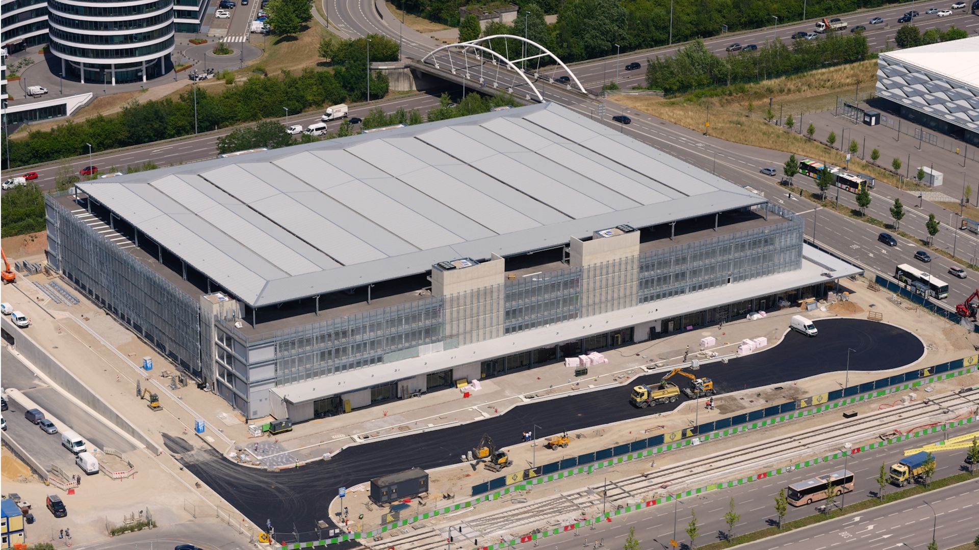 Une toiture métallique couvre les places de parking du dernier étage. Ce concept présente le grand avantage que ces places de parking sont utilisables en tout temps, même en cas de neige, de fortes pluies et d’ensoleillement intense. La toiture de 6420 m2 pourra être utilisée pour l’implantation de panneaux photovoltaïques.