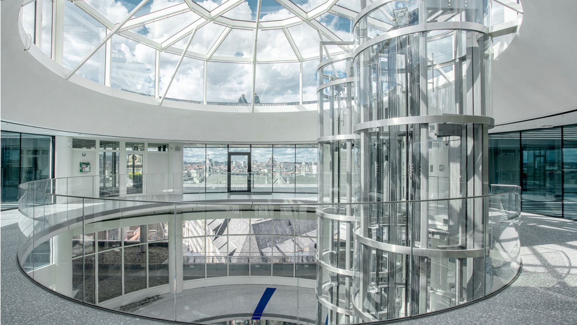 Dans l’atrium principal du nouveau bâtiment administratif de la Ville de Bruxelles, deux ascenseurs panoramiques élèvent le personnel et les visiteurs jusqu’au 8ème étage. La mission était de réaliser deux structures en acier sur une base ronde et créer ainsi deux énormes cylindres transparents de verre et d’acier sur une hauteur d'environ 30 m.