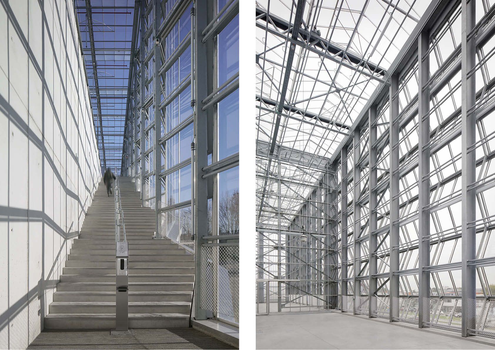 Het zijn vooral de uitkragende voor- en achterzijde van de ranke serreconstructie die in het oog springen. Aan de staart van het gebouw is een voorplein met een monumentale entreetrap voorzien. Deze laatste is 11 m hoog en lijkt te zweven, aangezien hij op 11 slanke kolommen rust. De serrekappen zijn er verticaal doorgetrokken over de gefacetteerde vliesgevel en vormen op die manier transparante erkers.