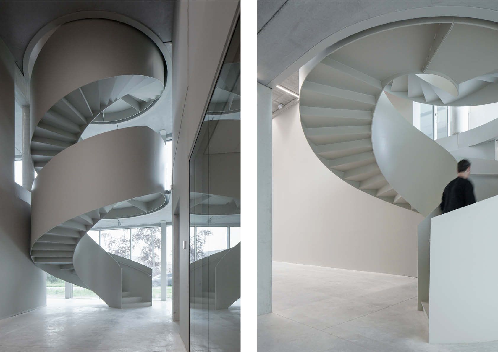 Op het gelijkvloers is een gemeenschappelijke vergaderzaal gekoppeld aan de genereuze inkomhal met uitnodigende ronde trap, die de vloeiende verbinding tussen de drie bouwlagen symboliseert. De zoektocht naar een elegante vormgeving mondde uit in de realisatie van een zelfdragende staalconstructie van 7,8 ton. De trap werd in twee verdiepingshoge delen geprefabriceerd in het atelier. Binnen in het volume van de trap zijn de bordessen verwerkt. Daar zijn de trapwanden doorgetrokken, zodat de onderbreking niet zichtbaar is in het volume. Op die manier ontstaat een imposante architecturale trap met een sterke ‘présence’.