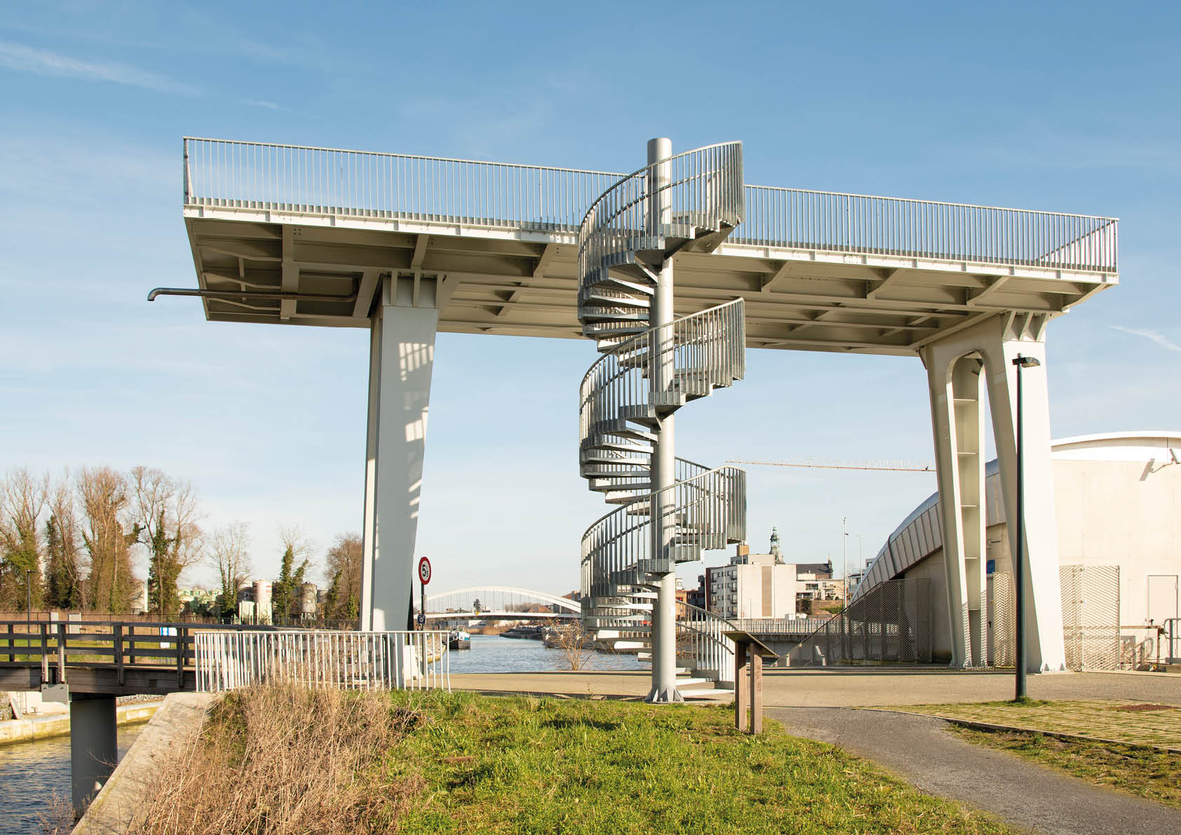 Federale parlementsleden die zich moeten verplaatsen tussen het historische Huis van de Parlementsleden en het Forumgebouw, het nieuwe vergadercomplex aan de overkant van de straat, hoeven dat voortaan niet meer in openlucht te doen. Sinds kort kunnen ze de oversteek maken via een fraaie ringvormige passerelle met spiegelgevels. De licht hellende brug kreeg de naam ‘Tondo’, naar de ronde schilderijtjes die erg populair waren tijdens de Renaissance, en is grotendeels opgetrokken uit staal.